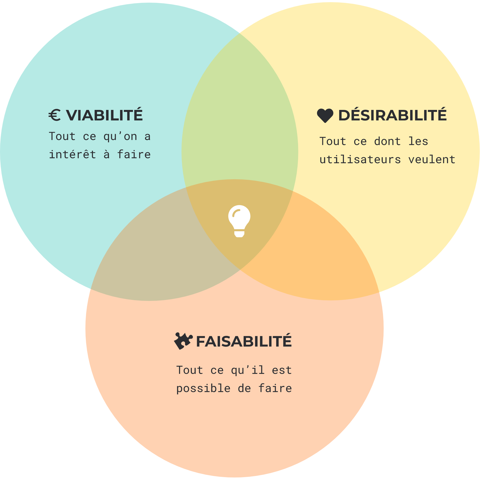 Négliger l'un de ces 3 axes peut mettre en péril le développement de votre produit : les utilisateurs n’en voudront pas, la viabilité économique ne sera pas au rendez-vous, la mise en œuvre sera trop compliquée.