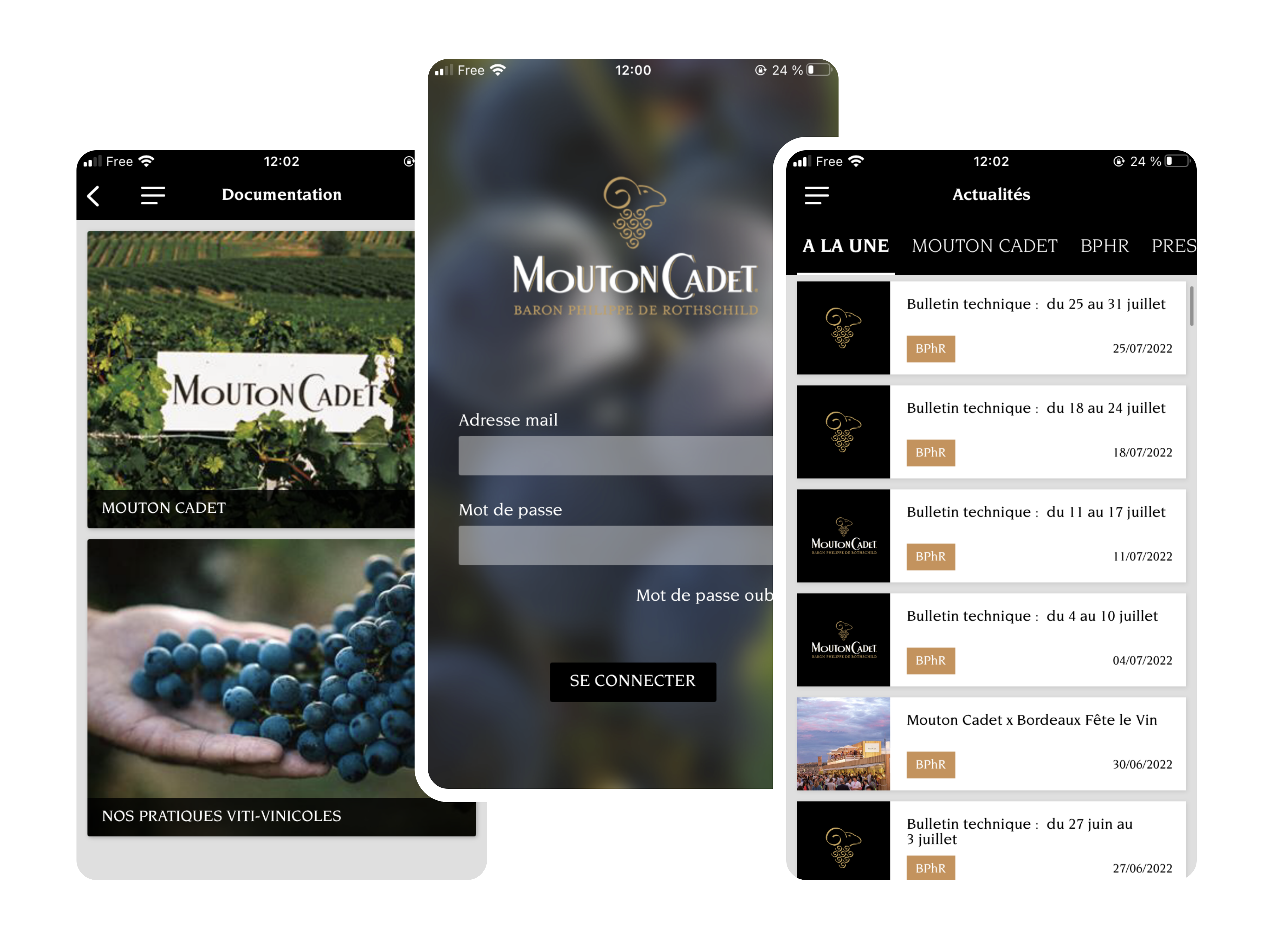 Application mobile et web à destination des partenaires viticulteurs. L’objectif de la solution est de consolider l’attachement de ces partenaires à la marque Mouton-Cadet en mettant à disposition différentes fonctionnalités : actualités, sondages, jeux-concours, messagerie, espace personnel, agenda, documentation technique et commerciale, etc.